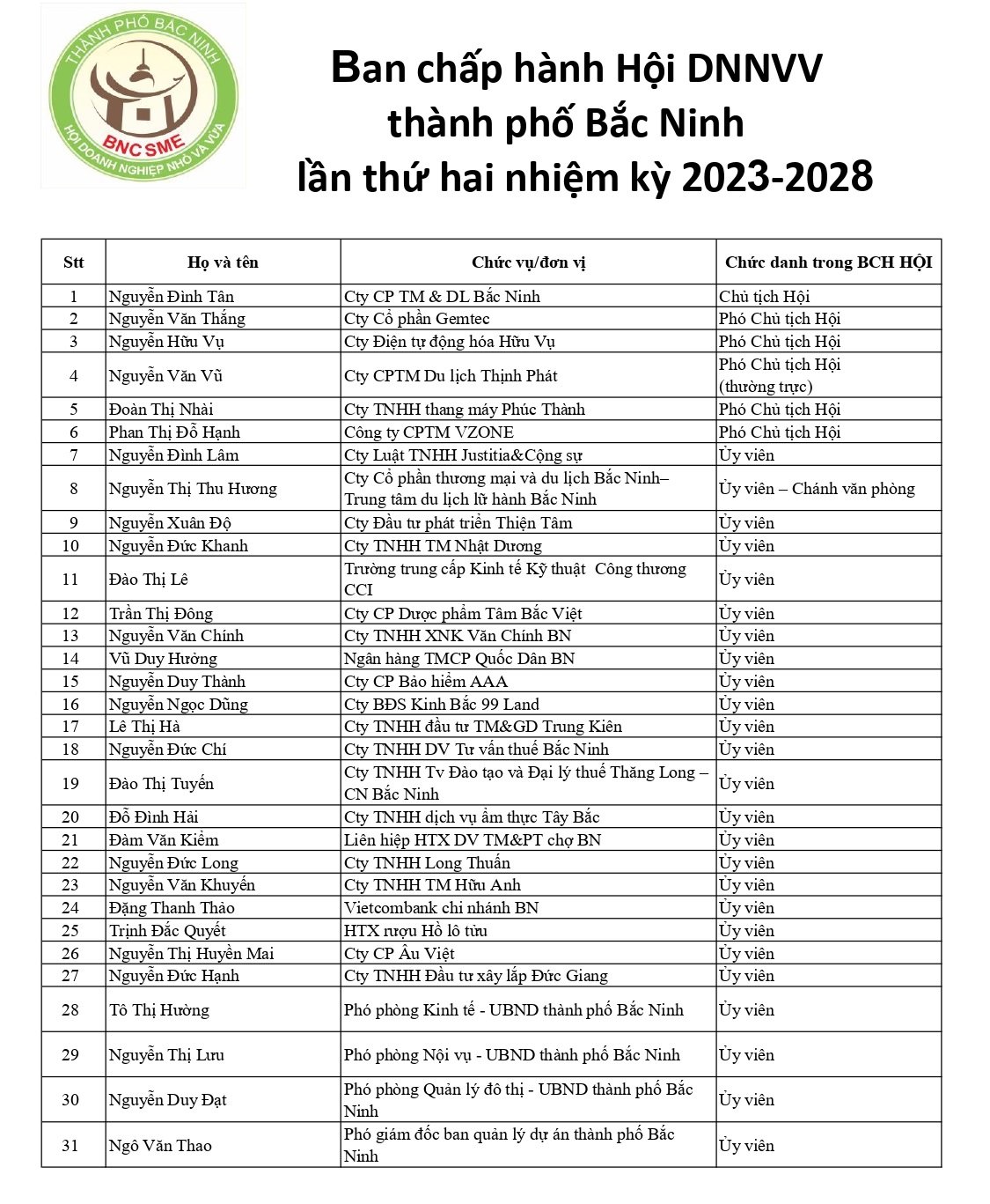Hội Doanh nghiệp nhỏ và vừa thành phố Bắc Ninh xin trân trọng giới thiệu danh sách Hội viên Ban chấp Hành hội và danh sách hội viên nhiệm kỳ 2023-2028 như sau: