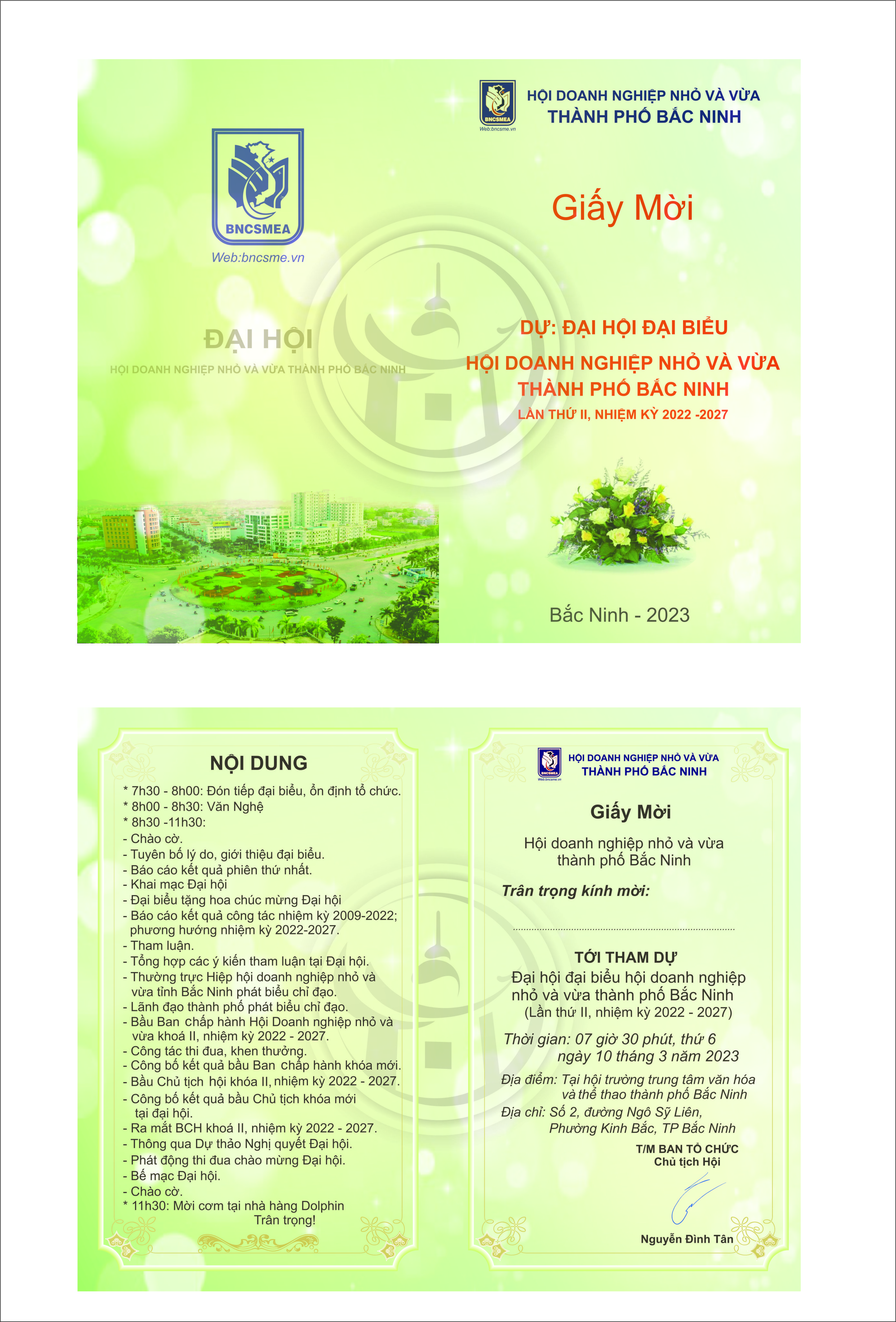 Mời tham dự Đại hội đại biểu nhiệm kỳ 2 của Hội Doanh nghiệp nhỏ và vừa thành phố Bắc Ninh ngày 10/3/2023